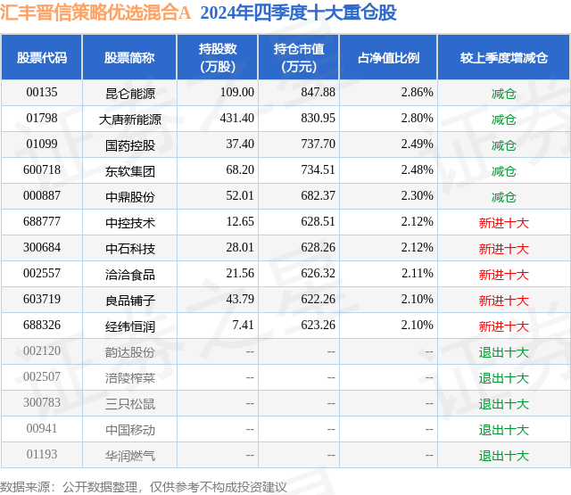 从基金规模来看,汇丰晋信策略优选混合A基金2024年四季度公布的基金规模为1.83亿元,较上一期规模2.56亿元变化了-7341.52万元,环比变化了-28.64%。该基金最新一期资产配置为:股票占净值比93.04%,无债券类资产,现金占净值比5.68%。从基金持仓来看,该基金当季前十大股票仓位达23.48%,第一大重仓股为昆仑能源(00135),持仓占比为2.86%。