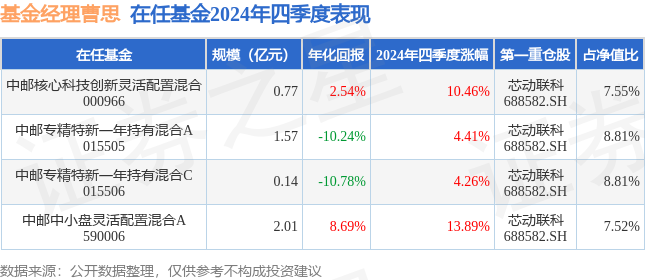 中邮专精特新一年持有混合C现任基金经理为曹思。其中在任基金经理曹思已从业10年又245天,2022年9月14日正式接手管理中邮专精特新一年持有混合C,任职期间累计回报为-23.0%。目前还管理着4只基金产品(包括A类和C类),其中本季度表现最佳的基金为中邮中小盘灵活配置混合A(590006),季度净值涨幅为13.89%。