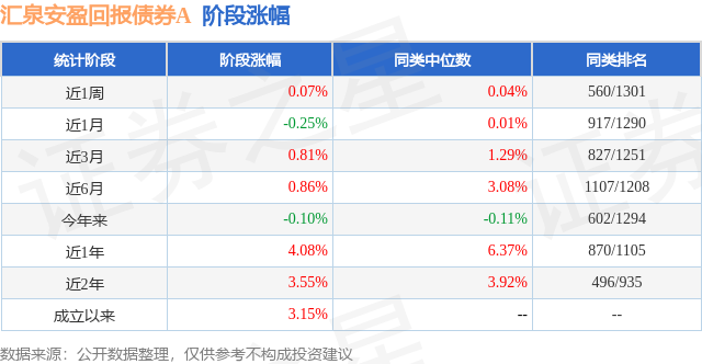 从业绩表现来看,汇泉安盈回报债券A基金过去一年净值涨幅为4.08%,在同类基金中排名870/1105,同类基金过去一年净值涨幅中位数为6.37%。而基金过去一年的最大回撤为-0.77%,成立以来的最大回撤为-2.6%。