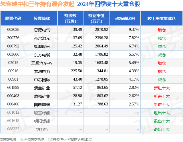 证券之星消息,日前朱雀碳中和三年持有混合发起基金公布四季报,2024年四季度最新规模3.07亿元,季度净值涨幅为1.26%。