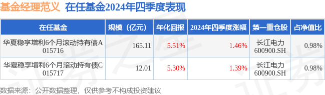从基金规模来看,华夏稳享增利6个月滚动持有债A基金2024年四季度公布的基金规模为165.11亿元,较上一期规模116.29亿元变化了48.82亿元,环比变化了41.98%。该基金最新一期资产配置为:股票占净值比5.29%,债券占净值比98.06%,现金占净值比0.66%。从基金持仓来看,该基金当季前十大股票仓位达3.82%,第一大重仓股为长江电力(600900),持仓占比为0.98%。