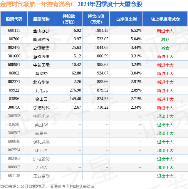 从基金规模来看,金鹰时代领航一年持有混合C基金2024年四季度公布的基金规模为2.04亿元,较上一期规模2.45亿元变化了-4085.2万元,环比变化了-16.66%。该基金最新一期资产配置为:股票占净值比92.89%,无债券类资产,现金占净值比0.43%。从基金持仓来看,该基金当季前十大股票仓位达35.44%,第一大重仓股为金山办公(688111),持仓占比为6.52%。