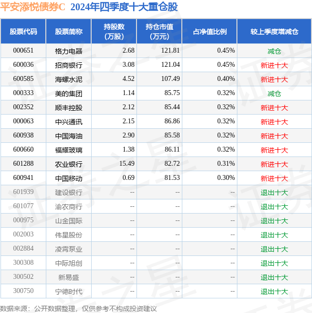 从基金规模来看,平安添悦债券C基金2024年四季度公布的基金规模为1.29亿元,较上一期规模9013.45万元变化了3918.61万元,环比变化了43.48%。该基金最新一期资产配置为:股票占净值比17.83%,债券占净值比80.48%,现金占净值比1.26%。从基金持仓来看,该基金当季前十大股票仓位达3.51%,第一大重仓股为格力电器(000651),持仓占比为0.45%。