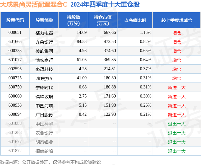 证券之星消息,日前大成景尚灵活配置混合C基金公布四季报,2024年四季度最新规模5.1亿元,季度净值涨幅为1.73%。