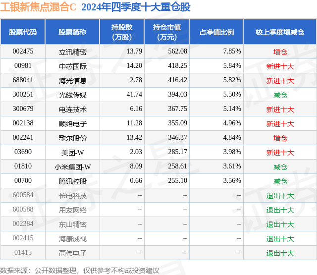 从基金规模来看,工银新焦点混合C基金2024年四季度公布的基金规模为0.29亿元,较上一期规模2390.42万元变化了521.5万元,环比变化了21.82%。该基金最新一期资产配置为:股票占净值比89.38%,无债券类资产,现金占净值比9.71%。从基金持仓来看,该基金当季前十大股票仓位达51.1%,第一大重仓股为立讯精密(002475),持仓占比为7.85%。