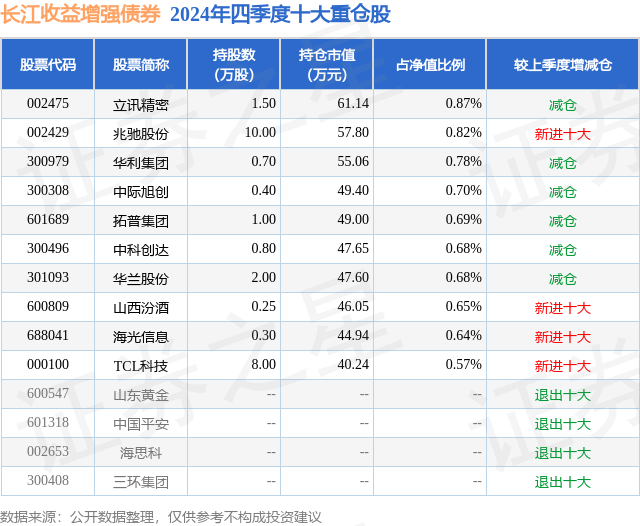 证券之星消息,日前长江收益增强债券基金公布四季报,2024年四季度最新规模0.71亿元,季度净值涨幅为1.65%。