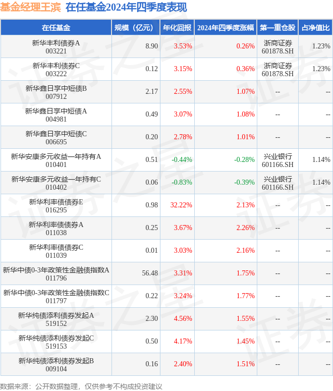 新华丰利债券A现任基金经理为王滨。其中在任基金经理王滨已从业7年又8天,2024年7月3日正式接手管理新华丰利债券A,任职期间累计回报为0.33%。目前还管理着15只基金产品(包括A类和C类),其中本季度表现最佳的基金为新华利率债债券A(011038),季度净值涨幅为2.26%。