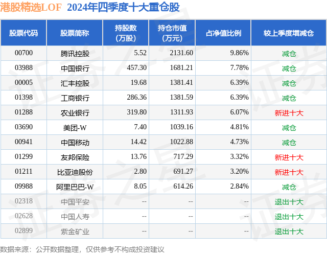 证券之星消息,日前港股精选LOF基金公布四季报,2024年四季度最新规模1.53亿元,季度净值涨幅为-0.78%。