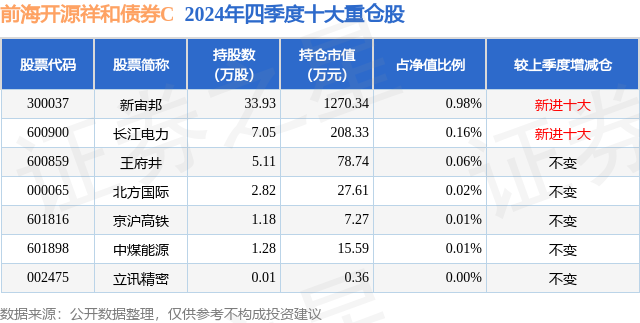 从基金规模来看,前海开源祥和债券C基金2024年四季度公布的基金规模为3.6亿元,较上一期规模4.17亿元变化了-5677.73万元,环比变化了-13.63%。该基金最新一期资产配置为:股票占净值比1.25%,债券占净值比81.37%,现金占净值比0.53%。从基金持仓来看,该基金当季前十大股票仓位达1.24%,第一大重仓股为新宙邦(300037),持仓占比为0.98%。