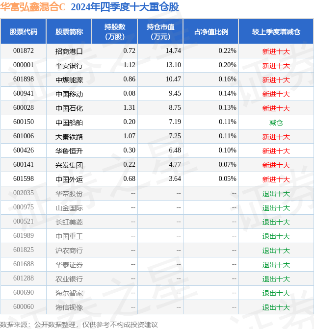 从基金规模来看,华富弘鑫混合C基金2024年四季度公布的基金规模为0.52亿元,较上一期规模2175.18万元变化了3000.33万元,环比变化了137.94%。该基金最新一期资产配置为:股票占净值比1.73%,债券占净值比102.75%,现金占净值比1.29%。从基金持仓来看,该基金当季前十大股票仓位达1.29%,第一大重仓股为招商港口(001872),持仓占比为0.22%。