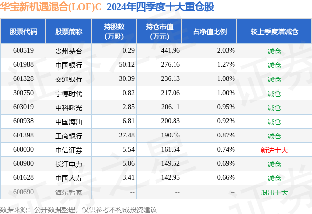 从基金规模来看,华宝新机遇混合(LOF)C基金2024年四季度公布的基金规模为1.67亿元,较上一期规模1.69亿元变化了-149.18万元,环比变化了-0.88%。该基金最新一期资产配置为:股票占净值比31.23%,债券占净值比57.38%,现金占净值比5.1%。从基金持仓来看,该基金当季前十大股票仓位达10.21%,第一大重仓股为贵州茅台(600519),持仓占比为2.03%。