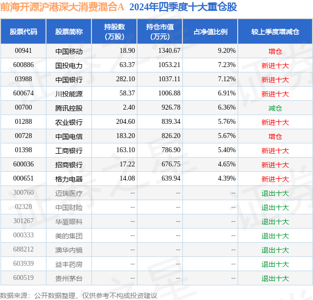 从基金规模来看,前海开源沪港深大消费混合A基金2024年四季度公布的基金规模为0.94亿元,较上一期规模1.05亿元变化了-1092.66万元,环比变化了-10.43%。该基金最新一期资产配置为:股票占净值比82.41%,无债券类资产,现金占净值比18.42%。从基金持仓来看,该基金当季前十大股票仓位达62.69%,第一大重仓股为中国移动(00941),持仓占比为9.2%。