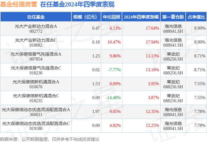 从基金规模来看,光大产业新动力混合A基金2024年四季度公布的基金规模为0.47亿元,较上一期规模3506.05万元变化了1191.33万元,环比变化了33.98%。该基金最新一期资产配置为:股票占净值比90.44%,债券占净值比6.43%,现金占净值比2.17%。从基金持仓来看,该基金当季前十大股票仓位达69.51%,第一大重仓股为海光信息(688041),持仓占比为8.9%。