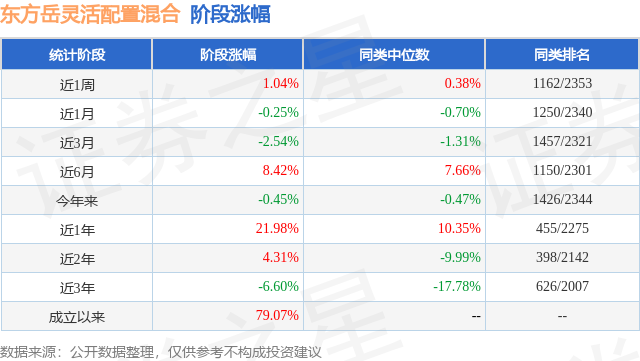 从业绩表现来看,东方岳灵活配置混合基金过去一年净值涨幅为21.98%,在同类基金中排名455/2275,同类基金过去一年净值涨幅中位数为10.35%。而基金过去一年的最大回撤为-13.02%,成立以来的最大回撤为-31.14%。
