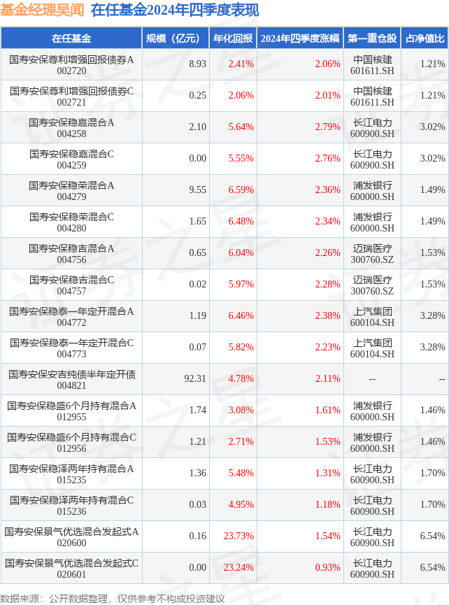 证券之星消息,日前国寿安保稳嘉混合C基金公布四季报,2024年四季度最新规模0.0亿元,季度净值涨幅为2.76%。