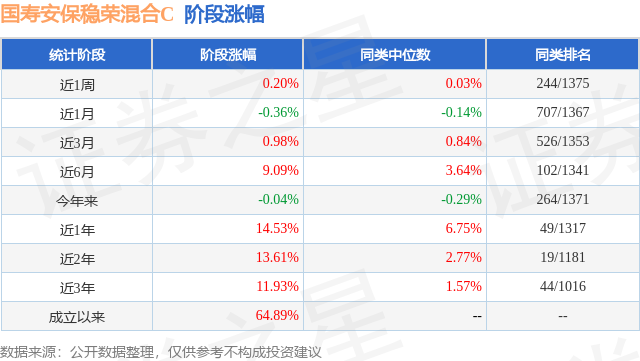 从业绩表现来看,国寿安保稳荣混合C基金过去一年净值涨幅为14.53%,在同类基金中排名49/1317,同类基金过去一年净值涨幅中位数为6.75%。而基金过去一年的最大回撤为-1.69%,成立以来的最大回撤为-4.32%。