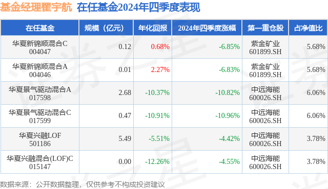 证券之星消息,日前华夏新锦顺混合A基金公布四季报,2024年四季度最新规模0.01亿元,季度净值涨幅为-6.83%。