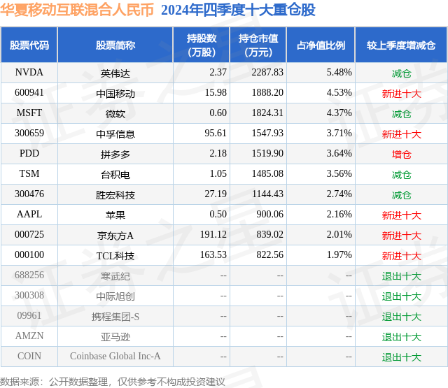 从基金规模来看,华夏移动互联混合人民币基金2024年四季度公布的基金规模为4.17亿元,较上一期规模4.29亿元变化了-1224.81万元,环比变化了-2.85%。该基金最新一期资产配置为:股票占净值比33.67%,债券占净值比5.22%,现金占净值比54.37%。从基金持仓来看,该基金当季前十大股票仓位达34.17%,第一大重仓股为英伟达(NVDA),持仓占比为5.48%。
