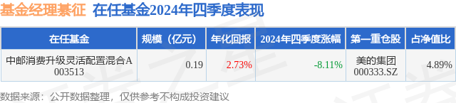 从基金规模来看,中邮消费升级灵活配置混合A基金2024年四季度公布的基金规模为0.19亿元,较上一期规模3335.26万元变化了-1474.26万元,环比变化了-44.2%。该基金最新一期资产配置为:股票占净值比76.15%,无债券类资产,现金占净值比20.13%。从基金持仓来看,该基金当季前十大股票仓位达34.46%,第一大重仓股为美的集团(000333),持仓占比为4.89%。