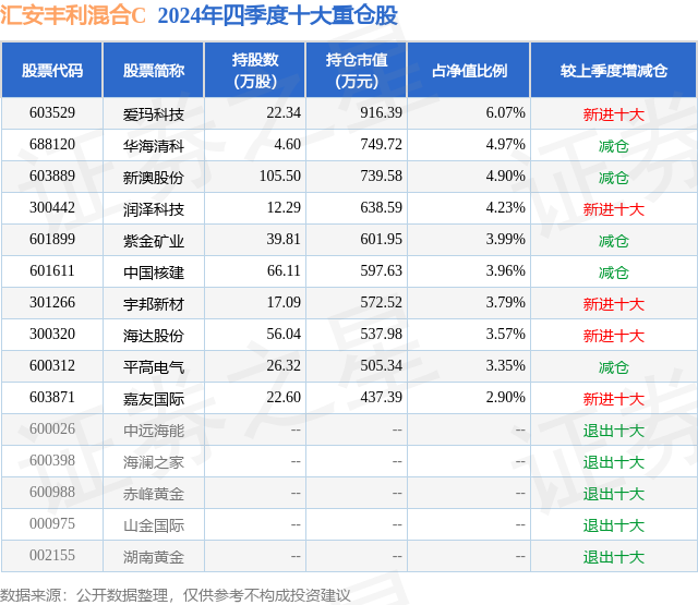 从基金规模来看,汇安丰利混合C基金2024年四季度公布的基金规模为0.97亿元,较上一期规模1.88亿元变化了-9152.64万元,环比变化了-48.67%。该基金最新一期资产配置为:股票占净值比90.13%,无债券类资产,现金占净值比12.17%。从基金持仓来看,该基金当季前十大股票仓位达41.73%,第一大重仓股为爱玛科技(603529),持仓占比为6.07%。