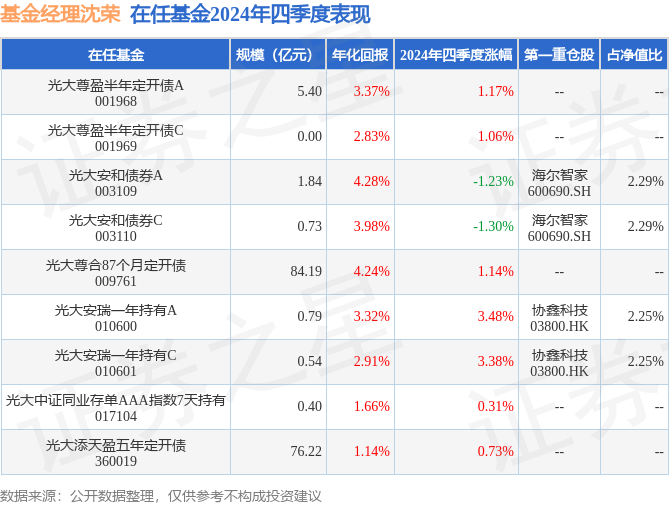 证券之星消息,日前光大安和债券A基金公布四季报,2024年四季度最新规模1.84亿元,季度净值涨幅为-1.23%。