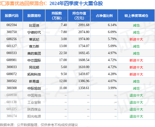从基金规模来看,汇添富优选回报混合C基金2024年四季度公布的基金规模为1.56亿元,较上一期规模4.36亿元变化了-2.8亿元,环比变化了-64.18%。该基金最新一期资产配置为:股票占净值比89.09%,无债券类资产,现金占净值比11.88%。从基金持仓来看,该基金当季前十大股票仓位达49.86%,第一大重仓股为比亚迪(002594),持仓占比为6.14%。