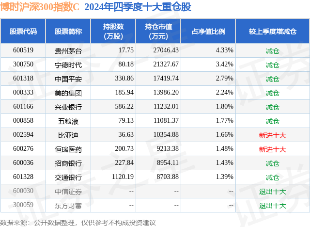 从基金规模来看,博时沪深300指数C基金2024年四季度公布的基金规模为12.86亿元,较上一期规模18.95亿元变化了-6.09亿元,环比变化了-32.14%。该基金最新一期资产配置为:股票占净值比94.11%,无债券类资产,现金占净值比6.18%。从基金持仓来看,该基金当季前十大股票仓位达22.31%,第一大重仓股为贵州茅台(600519),持仓占比为4.33%。