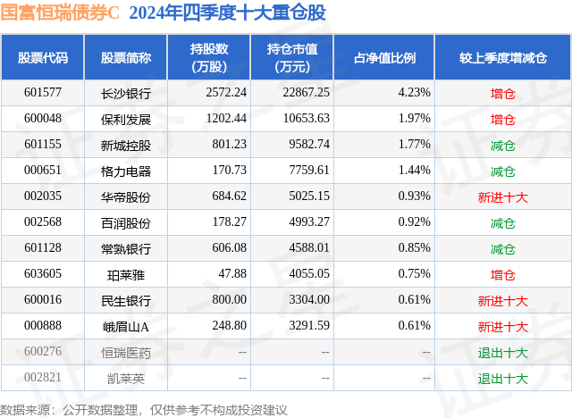 从基金规模来看,国富恒瑞债券C基金2024年四季度公布的基金规模为6.78亿元,较上一期规模2.68亿元变化了4.1亿元,环比变化了152.93%。该基金最新一期资产配置为:股票占净值比14.55%,债券占净值比81.49%,现金占净值比4.16%。从基金持仓来看,该基金当季前十大股票仓位达14.08%,第一大重仓股为长沙银行(601577),持仓占比为4.23%。