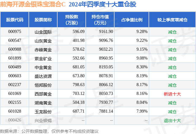 证券之星消息,日前前海开源金银珠宝混合C基金公布四季报,2024年四季度最新规模6.62亿元,季度净值涨幅为-15.48%。