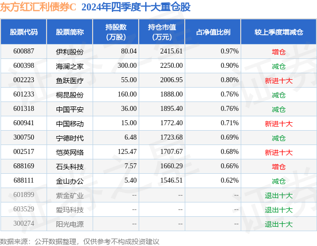 证券之星消息,日前东方红汇利债券C基金公布四季报,2024年四季度最新规模2.26亿元,季度净值涨幅为0.5%。