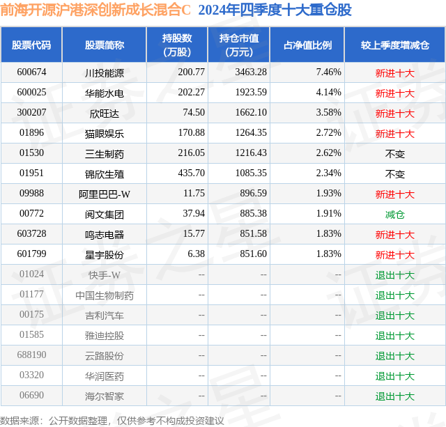 从基金规模来看,前海开源沪港深创新成长混合C基金2024年四季度公布的基金规模为1.27亿元,较上一期规模1.58亿元变化了-3035.26万元,环比变化了-19.23%。该基金最新一期资产配置为:股票占净值比47.65%,无债券类资产,现金占净值比52.81%。从基金持仓来看,该基金当季前十大股票仓位达30.36%,第一大重仓股为川投能源(600674),持仓占比为7.46%。