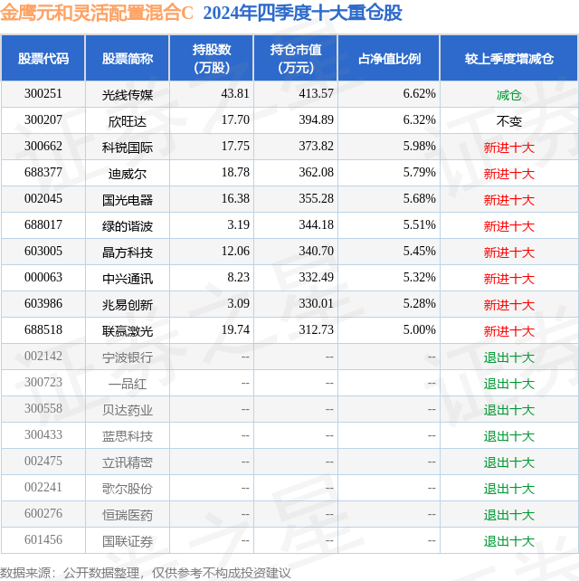 从基金规模来看,金鹰元和灵活配置混合C基金2024年四季度公布的基金规模为0.14亿元,较上一期规模2612.68万元变化了-1239.75万元,环比变化了-47.45%。该基金最新一期资产配置为:股票占净值比86.22%,无债券类资产,现金占净值比15.15%。从基金持仓来看,该基金当季前十大股票仓位达56.95%,第一大重仓股为光线传媒(300251),持仓占比为6.62%。