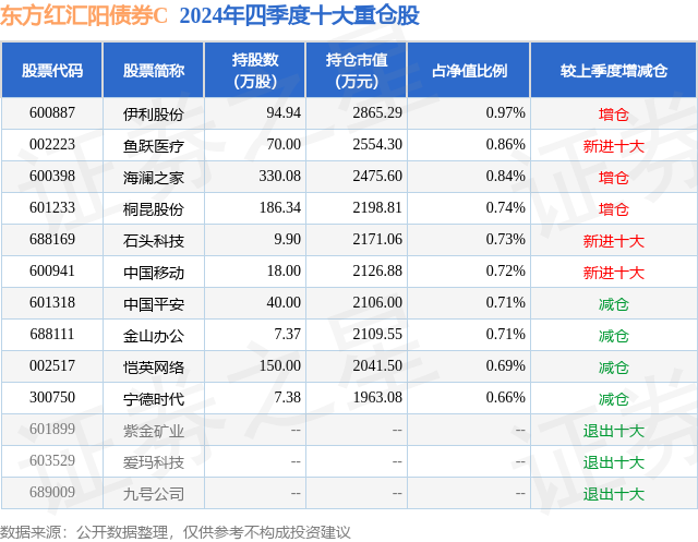 从基金规模来看,东方红汇阳债券C基金2024年四季度公布的基金规模为4.37亿元,较上一期规模3.09亿元变化了1.28亿元,环比变化了41.39%。该基金最新一期资产配置为:股票占净值比18.29%,债券占净值比83.05%,现金占净值比1.23%。从基金持仓来看,该基金当季前十大股票仓位达7.63%,第一大重仓股为伊利股份(600887),持仓占比为0.97%。