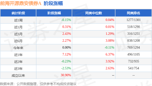 从业绩表现来看,前海开源鼎安债券A基金过去一年净值涨幅为7.12%,在同类基金中排名496/1105,同类基金过去一年净值涨幅中位数为6.37%。而基金过去一年的最大回撤为-1.01%,成立以来的最大回撤为-10.38%。