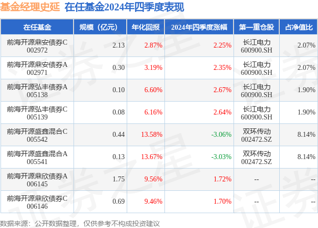 前海开源鼎安债券A现任基金经理为史延 田维。其中在任基金经理史延已从业5年又256天,2024年1月9日正式接手管理前海开源鼎安债券A,任职期间累计回报为6.43%。目前还管理着8只基金产品(包括A类和C类),其中本季度表现最佳的基金为前海开源弘丰债券A(005138),季度净值涨幅为2.67%。