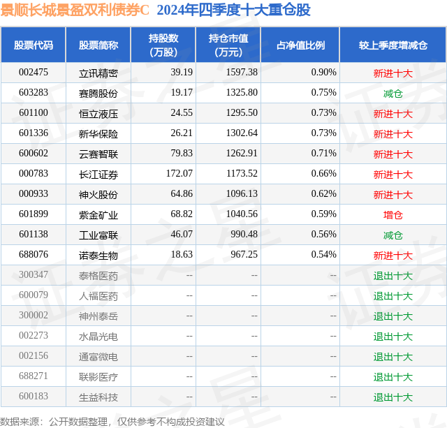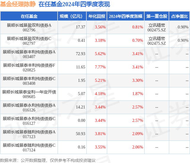 从基金规模来看,景顺长城景盈双利债券C基金2024年四季度公布的基金规模为0.41亿元,较上一期规模2536.24万元变化了1597.02万元,环比变化了62.97%。该基金最新一期资产配置为:股票占净值比19.01%,债券占净值比93.6%,现金占净值比0.8%。从基金持仓来看,该基金当季前十大股票仓位达6.79%,第一大重仓股为立讯精密(002475),持仓占比为0.9%。