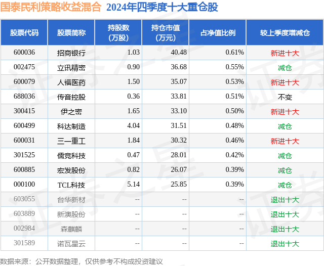 从基金规模来看,国泰民利策略收益混合基金2024年四季度公布的基金规模为0.66亿元,较上一期规模6624.43万元变化了-1.55万元,环比变化了-0.02%。该基金最新一期资产配置为:股票占净值比14.25%,债券占净值比54.92%,现金占净值比31.03%。从基金持仓来看,该基金当季前十大股票仓位达4.84%,第一大重仓股为招商银行(600036),持仓占比为0.61%。