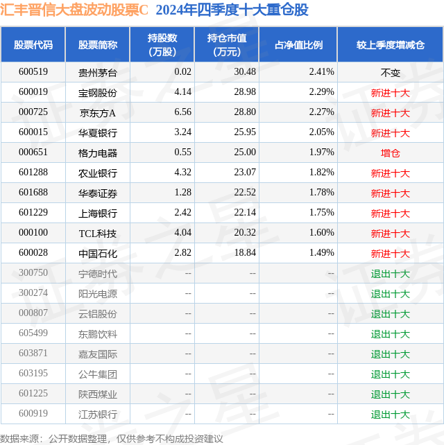 从基金规模来看,汇丰晋信大盘波动股票C基金2024年四季度公布的基金规模为0.02亿元,较上一期规模198.98万元变化了-20.68万元,环比变化了-10.39%。该基金最新一期资产配置为:股票占净值比92.89%,无债券类资产,现金占净值比7.39%。从基金持仓来看,该基金当季前十大股票仓位达19.43%,第一大重仓股为贵州茅台(600519),持仓占比为2.41%。