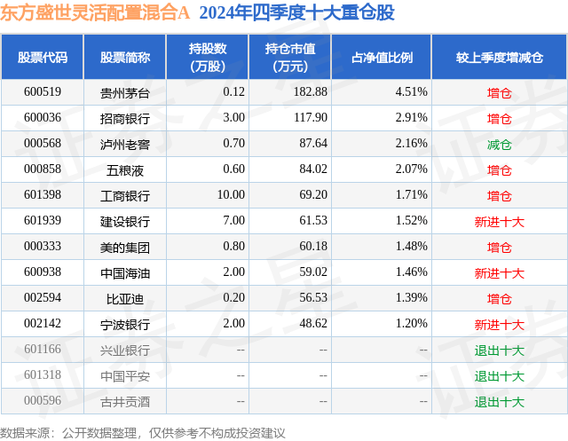 证券之星消息,日前东方盛世灵活配置混合A基金公布四季报,2024年四季度最新规模0.0亿元,季度净值涨幅为-0.8%。