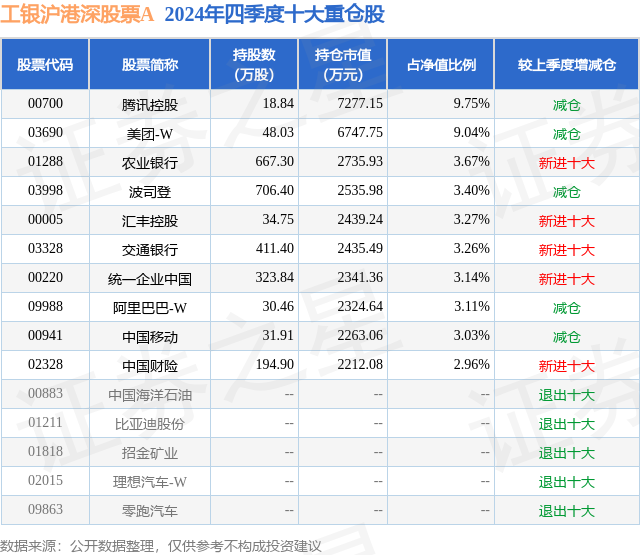 从基金规模来看,工银沪港深股票A基金2024年四季度公布的基金规模为6.36亿元,较上一期规模8.58亿元变化了-2.22亿元,环比变化了-25.91%。该基金最新一期资产配置为:股票占净值比89.35%,无债券类资产,现金占净值比11.96%。从基金持仓来看,该基金当季前十大股票仓位达44.63%,第一大重仓股为腾讯控股(00700),持仓占比为9.75%。