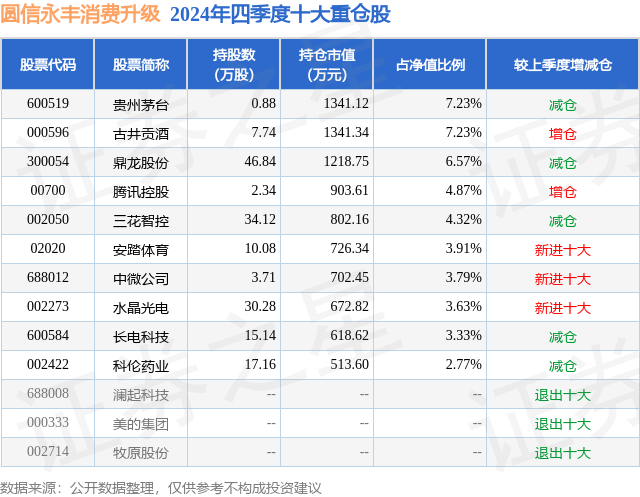 从基金规模来看,圆信永丰消费升级基金2024年四季度公布的基金规模为1.86亿元,较上一期规模1.97亿元变化了-1105.37万元,环比变化了-5.62%。该基金最新一期资产配置为:股票占净值比93.08%,债券占净值比5.35%,现金占净值比0.74%。从基金持仓来看,该基金当季前十大股票仓位达47.65%,第一大重仓股为贵州茅台(600519),持仓占比为7.23%。