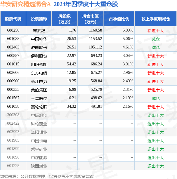 从基金规模来看,华安研究精选混合A基金2024年四季度公布的基金规模为2.22亿元,较上一期规模2.61亿元变化了-3955.5万元,环比变化了-15.14%。该基金最新一期资产配置为:股票占净值比77.54%,无债券类资产,现金占净值比24.37%。从基金持仓来看,该基金当季前十大股票仓位达32.92%,第一大重仓股为寒武纪(688256),持仓占比为5.09%。