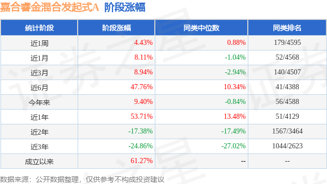 从业绩表现来看,嘉合睿金混合发起式A基金过去一年净值涨幅为53.71%,在同类基金中排名51/4129,同类基金过去一年净值涨幅中位数为13.48%。而基金过去一年的最大回撤为-29.76%,成立以来的最大回撤为-66.57%。