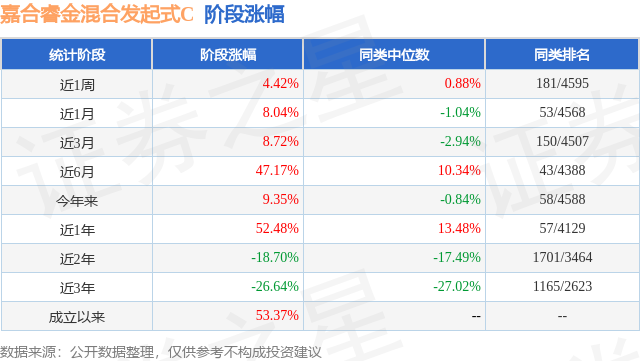 从业绩表现来看,嘉合睿金混合发起式C基金过去一年净值涨幅为52.48%,在同类基金中排名57/4129,同类基金过去一年净值涨幅中位数为13.48%。而基金过去一年的最大回撤为-29.98%,成立以来的最大回撤为-67.22%。