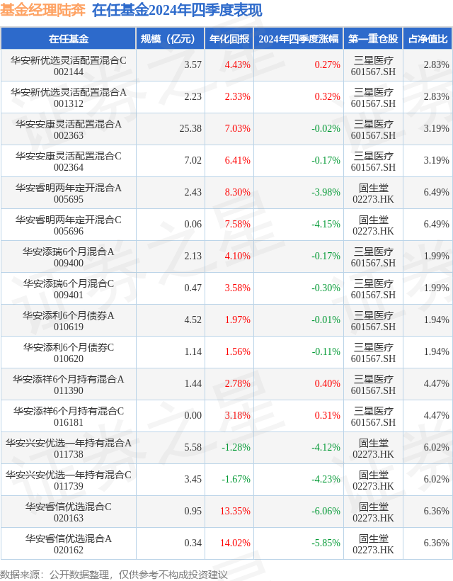 从基金规模来看,华安睿明两年定开混合C基金2024年四季度公布的基金规模为0.06亿元,较上一期规模632.26万元变化了-61.89万元,环比变化了-9.79%。该基金最新一期资产配置为:股票占净值比82.3%,无债券类资产,现金占净值比21.0%。从基金持仓来看,该基金当季前十大股票仓位达39.11%,第一大重仓股为固生堂(02273),持仓占比为6.49%。