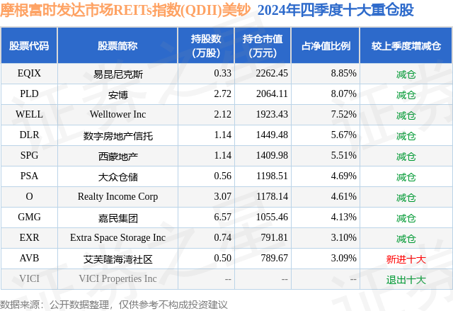 从基金规模来看,摩根富时发达市场REITs指数(QDII)美钞基金2024年四季度公布的基金规模为2.43亿元,较上一期规模2.97亿元变化了-5404.51万元,环比变化了-18.22%。该基金最新一期资产配置为:无股票类资产,无债券类资产,现金占净值比8.78%。从基金持仓来看,该基金当季前十大股票仓位达55.24%,第一大重仓股为易昆尼克斯(EQIX),持仓占比为8.85%。