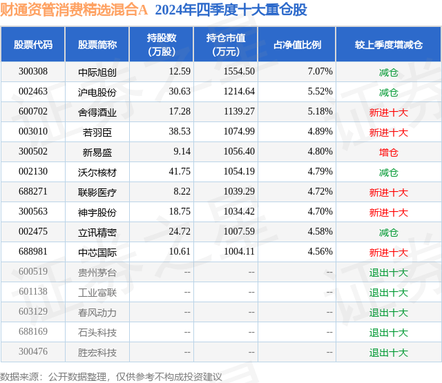 从基金规模来看,财通资管消费精选混合A基金2024年四季度公布的基金规模为2.05亿元,较上一期规模2.02亿元变化了336.75万元,环比变化了1.67%。该基金最新一期资产配置为:股票占净值比94.45%,无债券类资产,现金占净值比6.71%。从基金持仓来看,该基金当季前十大股票仓位达50.81%,第一大重仓股为中际旭创(300308),持仓占比为7.07%。