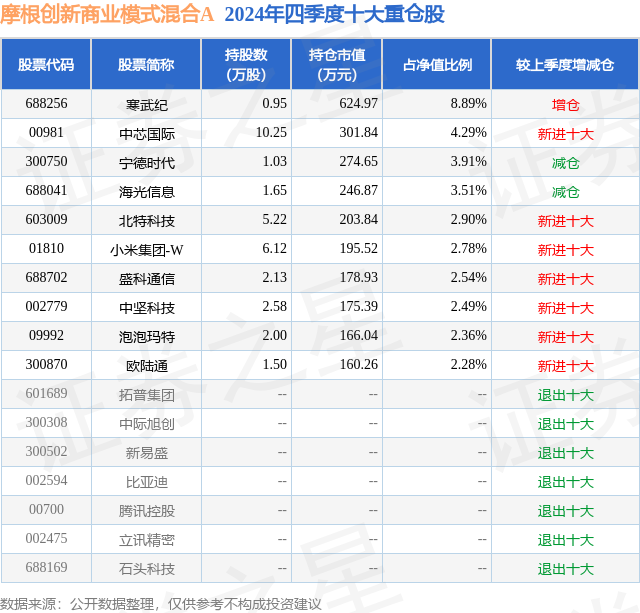 从基金规模来看,摩根创新商业模式混合A基金2024年四季度公布的基金规模为0.7亿元,较上一期规模6794.83万元变化了224.71万元,环比变化了3.31%。该基金最新一期资产配置为:股票占净值比88.88%,无债券类资产,现金占净值比15.4%。从基金持仓来看,该基金当季前十大股票仓位达35.95%,第一大重仓股为寒武纪(688256),持仓占比为8.89%。