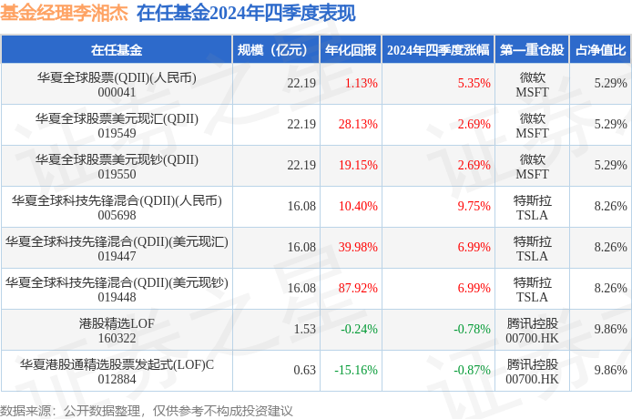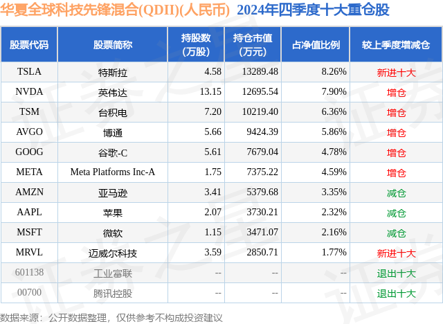 从基金规模来看,华夏全球科技先锋混合(QDII)(人民币)基金2024年四季度公布的基金规模为16.08亿元,较上一期规模10.26亿元变化了5.82亿元,环比变化了56.69%。该基金最新一期资产配置为:股票占净值比63.77%,无债券类资产,现金占净值比12.67%。从基金持仓来看,该基金当季前十大股票仓位达47.35%,第一大重仓股为特斯拉(TSLA),持仓占比为8.26%。
