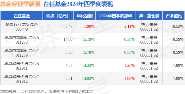 证券之星消息,日前华夏行业龙头混合基金公布四季报,2024年四季度最新规模5.47亿元,季度净值涨幅为2.11%。